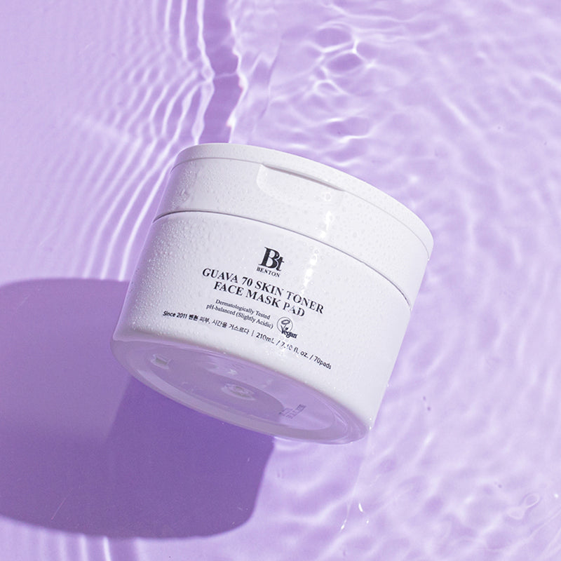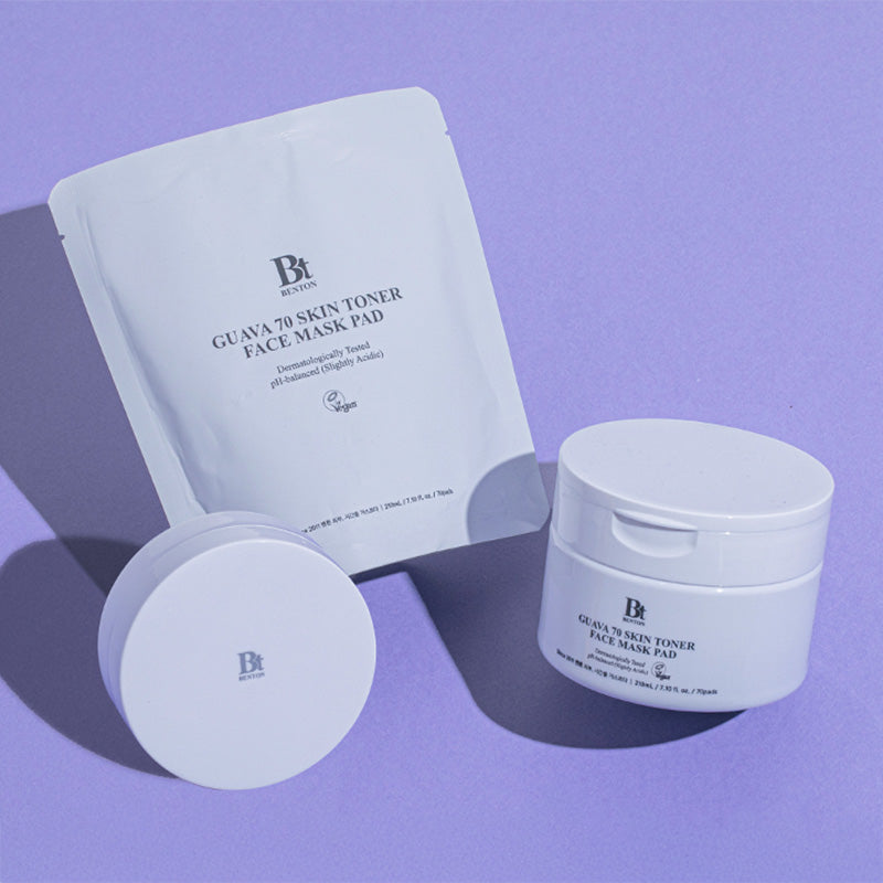Experience deep hydration and soothing care with the Benton Guava 70 Skin Toner Face Mask Pad, enriched with 70% Jeju-grown Guava Leaf Extract, a powerhouse of antioxidants, including vitamins C and E, to nourish and revitalize the skin. Infused with seven plant-based soothing extracts, azulene, and low molecular weight hyaluronic acid, these vegan-certified pads help calm irritation, refine texture, and restore moisture and elasticity.