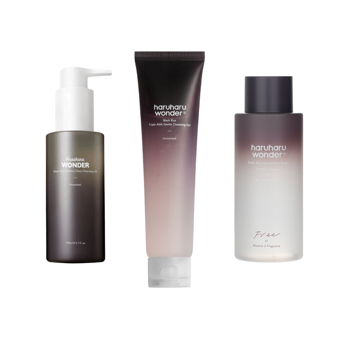 - Black Rice Triple AHA Gentle Cleansing Gel (100 ml): pH-balanced vegan gel with Triple AHA for gentle exfoliation, fermented black rice for antioxidants, and Betaine and Glycerin for hydration, leaving skin smooth and refreshed.