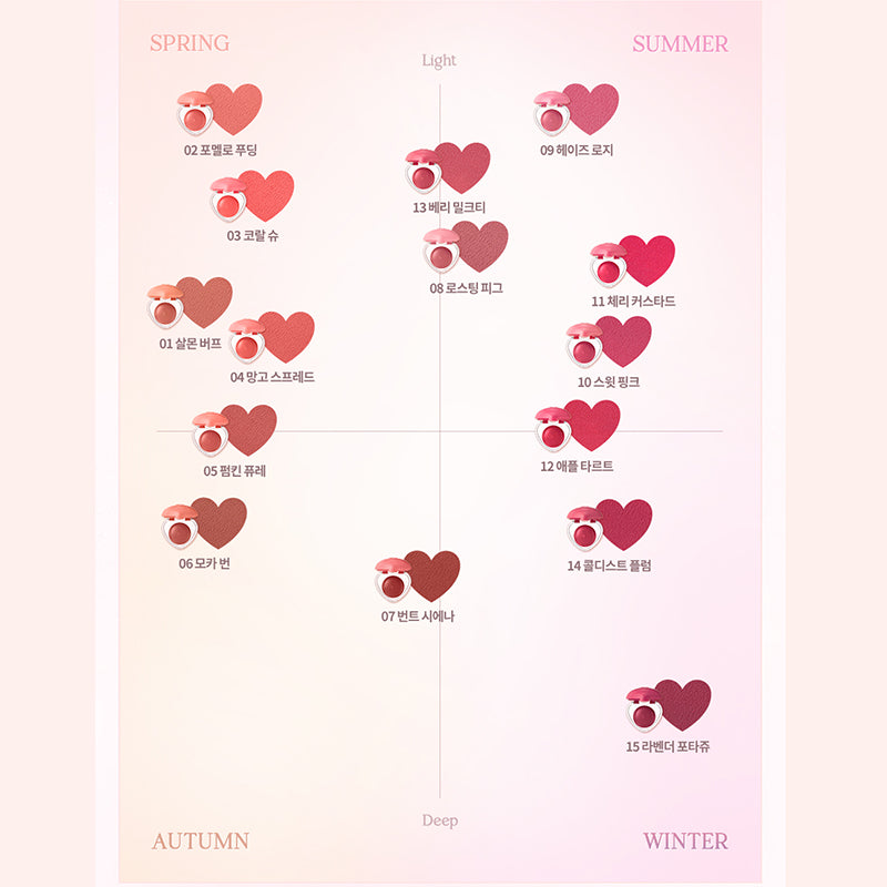 Encased in a charming heart-shaped pot, this dual-purpose essential streamlines your routine with stunning shades ranging from warm nudy corals to romantic cool pinks. The included mini brush adds convenience, making touch-ups a breeze. Whether you're creating a radiant daytime look or an elegant evening vibe, the Souffle Color Pot has you covered for every occasion.