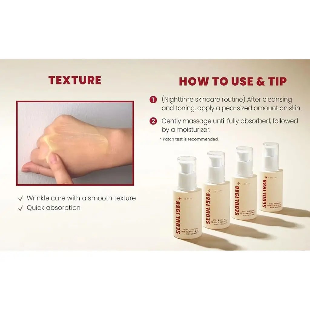 Boost your skin's renewal cycle and restore youthful vitality with the KSECRET SEOUL 1988 Serum: Retinal Liposome 2% + Black Ginseng, a next-generation anti-ageing serum that combines the power of encapsulated Retinal (Vitamin A) and Black Ginseng Extract. Designed to target fine lines, uneven skin tone, and rough texture, this potent yet gentle formula helps improve elasticity, fade dark spots, and support collagen production without the irritation commonly associated with retinoids.