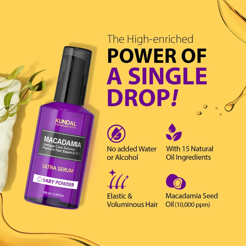The KUNDAL Macadamia Ultra Hair Serum is a pure, highly concentrated serum that does not contain water or alcohol. KUNDAL's Macadamia Ultra Hair Serum contains 10,000 ppm of macadamia and 15 natural plant-derived oils (Argan Oil, Macadamia Seed Oil, Avocado Oil, Coconut Oil, and more!) to moisturize and nourish dull, brittle, and dry hair.