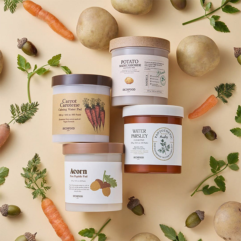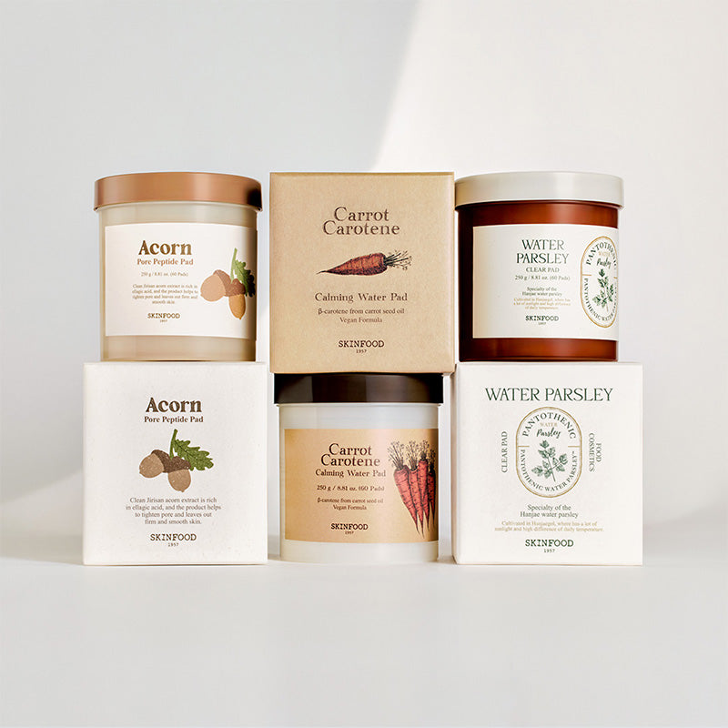 SKINFOOD Acorn Pore Peptide Pad is a gentle exfoliating toner pad infused with Jirisan acorn extract (Anti-Sebu m P) that helps tighten pores, smooth skin texture, and maintain skin elasticity. The pads are soaked in essence with peptides, witch hazel, chestnut shell extract, caffeine-free botanical oils, and humectants such as niacinamide and glycerin to soothe, hydrate, and refine skin without over-drying.