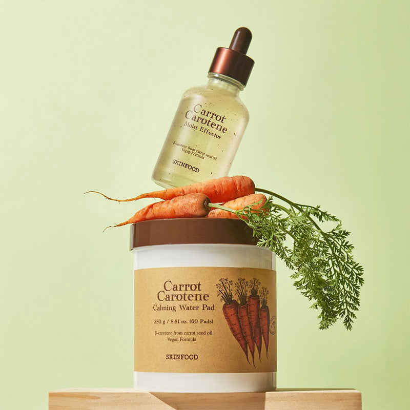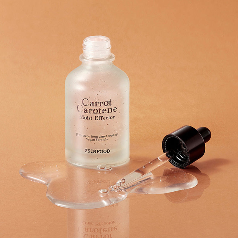 SKINFOOD Carrot Carotene Moist Effector is an ampoule-like serum built around carrot root extract and carrot seed oil, delivering high beta-carotene concentration (about 75 %) to help soothe and nourish skin. The lightweight texture layers well under other skincare, offering moisture, antioxidant protection, and calming effects. Ingredients like glycerin, panthenol, ceramide NP, and sodium hyaluronate support hydration and skin barrier health, while botanical oils and extracts add emollient and soothing benefits.