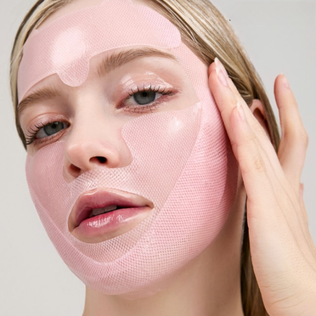- Lifting hydrogel mask designed in 3 parts to contour and tighten sagging skin for a sculpted jawline.