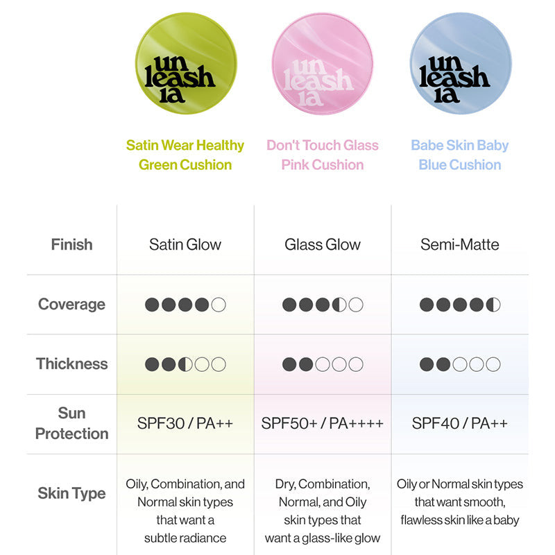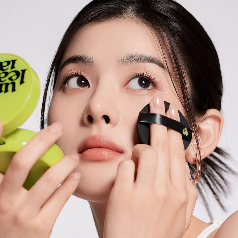 The Unleashia Satin Wear Healthy Green Cushion offers lightweight yet flawless coverage with added skincare benefits for a subtle glow. This vegan cushion foundation is enriched with bakuchiol, 76% water essence, and papaya fruit extract to maintain skin health while delivering a natural semi-matte satin finish. It provides SPF30 PA++ sun protection and is packed with soothing and nourishing ingredients like parsley extract. The high-adherence, long-lasting formula ensures natural coverage and hydration.